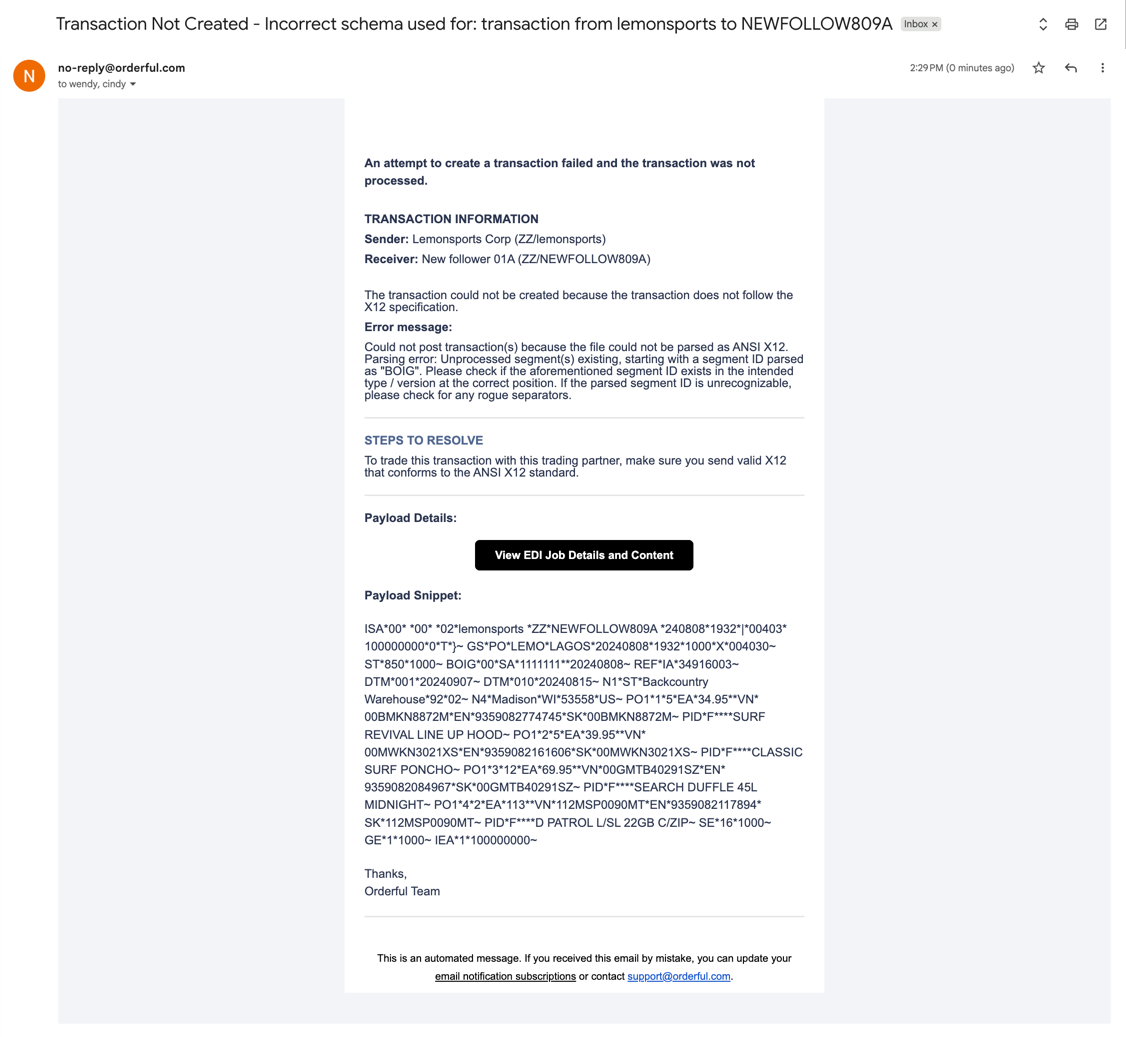 When you receive an email about a transaction that couldn't get created, we added a direct link "View EDI Job Details and Content" to the corresponding EDI Job in Orderful.