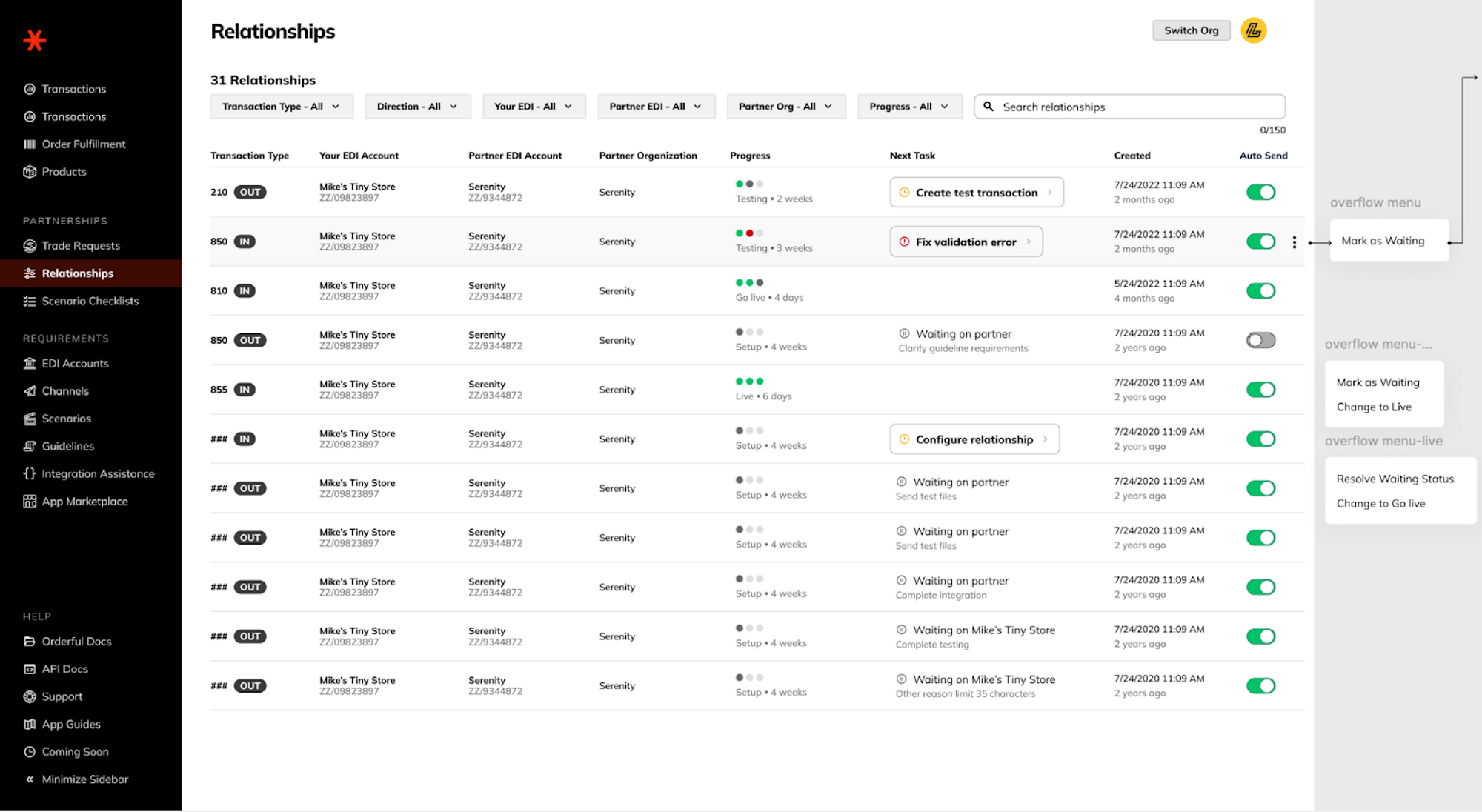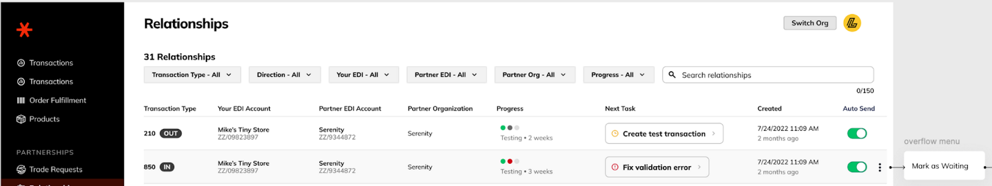 - Relationship drill-down - Click a partnership to see each document type (e.g., 850, 855), its progress, next task, and any Waiting flags.