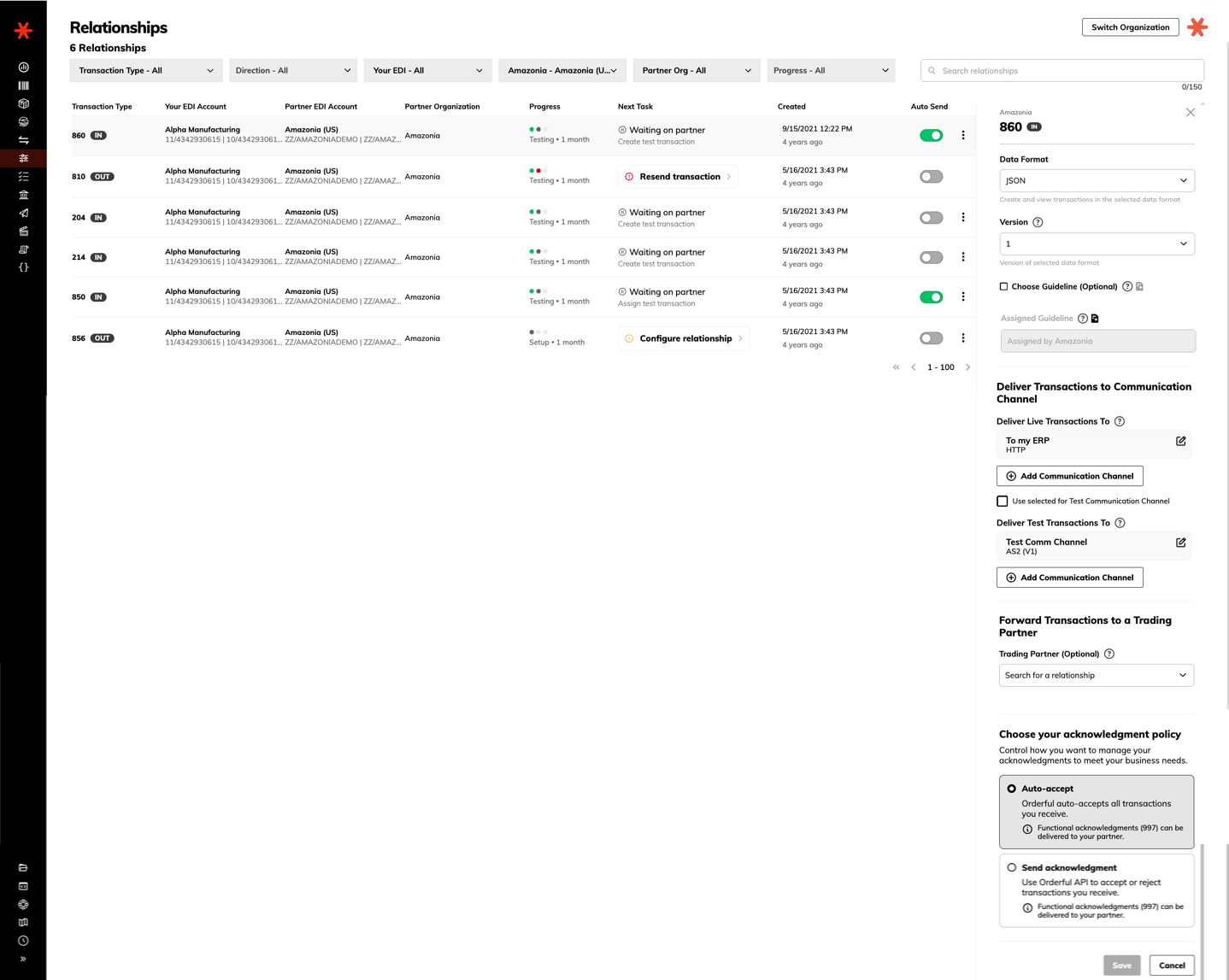 This change moves configuration from an ambiguous checkbox to clear policy options, ensuring you always know the exact operational flow for acknowledging transactions and sending acknowledgments back to your partners. Additionally, the new UI provides confirmation on whether your partner can receive the required 997 or CONTRL acknowledgment.